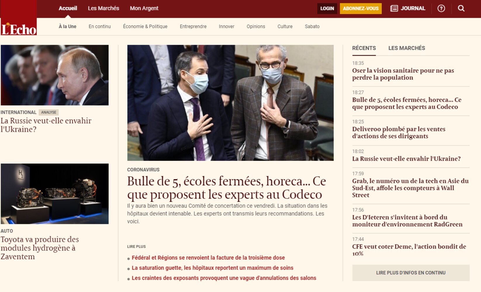 L’Echo est un quotidien belge d’information politique, économique et financière. Ce quotidien est seulement destiné à la communauté francophone de Belgique. Vous retrouvez un large choix de thèmes ainsi que sujet d’actualité. L’Echo vous permet de le lire en papier, mais aussi sur toute plateforme : smartphone ordinateur et tablette.