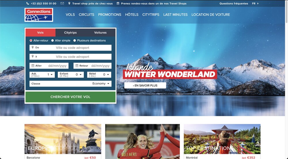Connections est un site de e-commerce sur lequel il est possible de réserver des voyages en ligne. Le site internet est accessible grâce à ce lien: https://www.connections.be. Connections propose des réservations de vol d’avions, de chambres d’hôtels, de location de voiture et même de city trips (vol et chambre d’hôtel combinés).